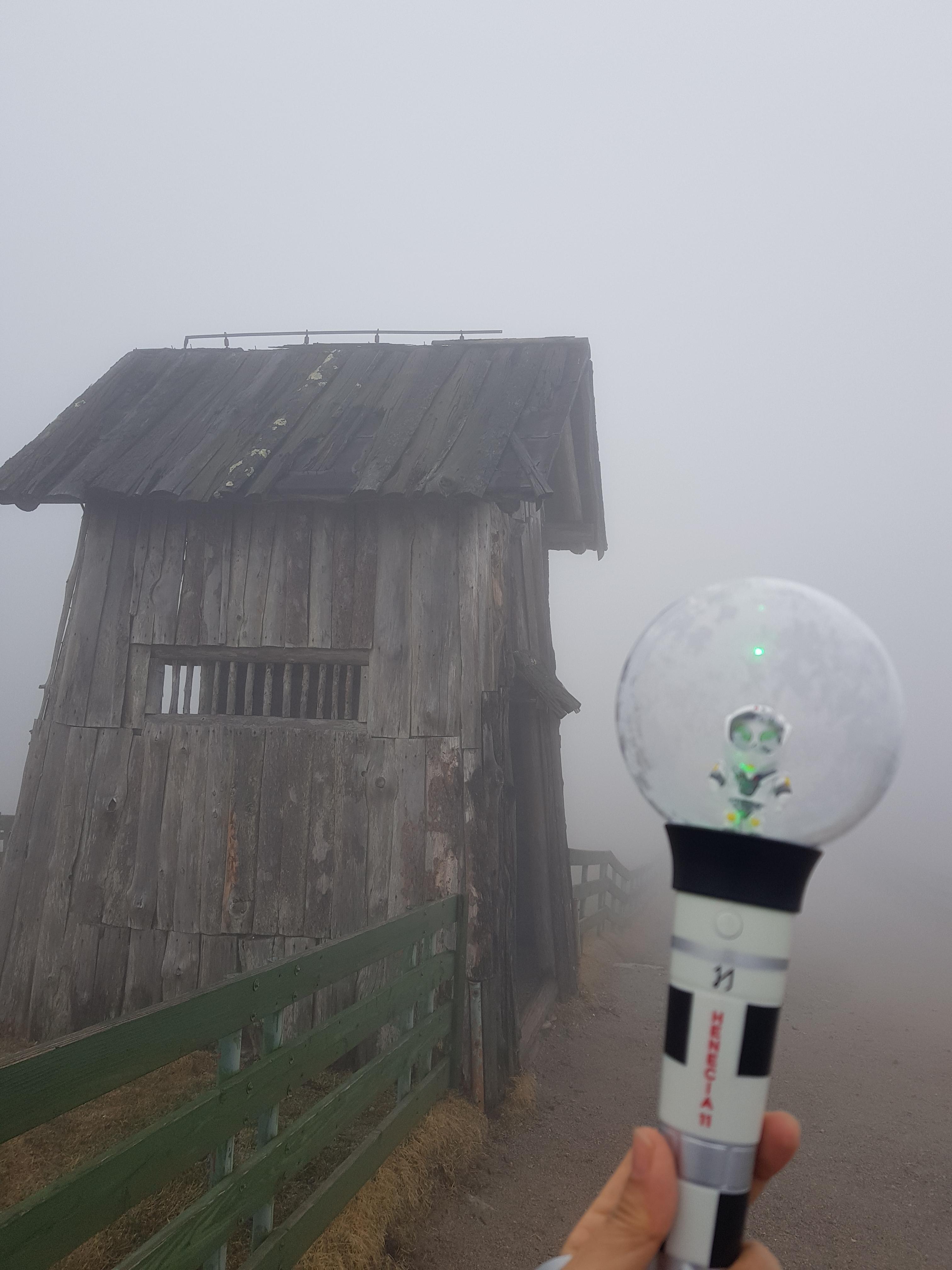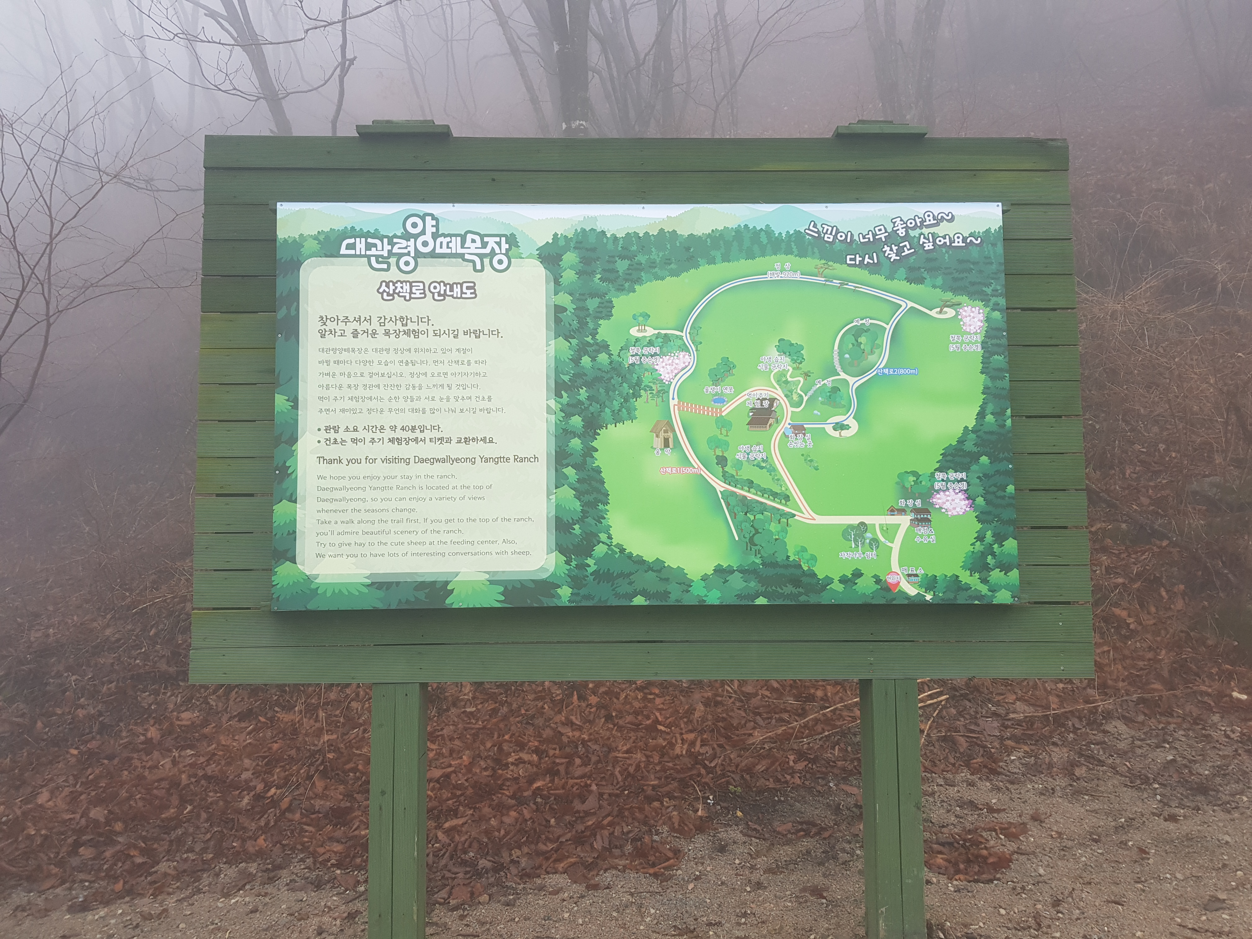 목장 직원이 안개가 걷힐 수도 있다고 해서 좀 올라갔었는데 쉬이 안개가 걷힐 것 같지 않아서 멈췄다.